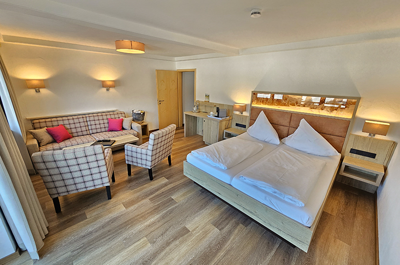 Zimmerausstattung: Sitzecke mit Schlafsofa für 2 Personen, zwei Sessel, Flachbild-TV, Schreibtisch mit Minibar, Safe, freies Wifi, Durchwahltelefon, Kofferablage, Bad mit Dusche, WC, Fön, Kosmetikspiegel, Doppelbett: 200 cm lang x 180 cm breit, Schlafsofa: 180 cm lang x 160 cm breit.