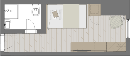Zimmerausstattung: Sessel, Flachbild-TV, Schreibtisch mit Minibar, Safe, freies Wifi, Durchwahltelefon, Kofferablage, Bad mit Dusche, WC, Fön, Kosmetikspiegel, Einzelbett: 200 cm lang x 90 cm breit.