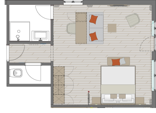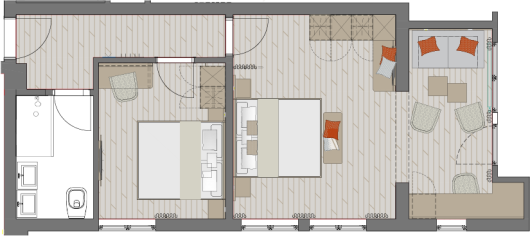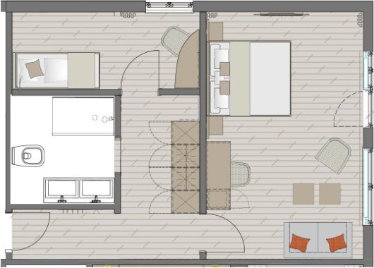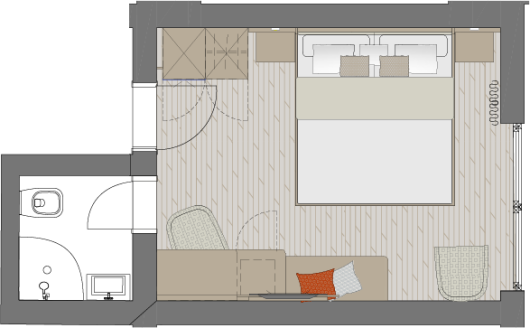 Zimmerausstattung: Sitzecke mit Schlafsofa für 2 Personen, zwei Sessel, Flachbild-TV, Schreibtisch mit Minibar, Safe, freies Wifi, Durchwahltelefon, Kofferablage, Bad mit Regen – Dusche, WC, Fön, Kosmetikspiegel, Doppelbett: 200 cm lang x 180 cm breit, Schlafsofa: 180 cm lang x 160 cm breit.