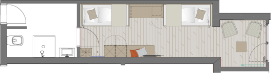Zimmerausstattung: Sitzecke mit zwei Sesseln, Flachbild-TV, Schreibtisch mit Minibar, Safe, freies Wifi, Durchwahltelefon, Kofferablage, Bad mit Dusche, WC, Fön, Kosmetikspiegel, 2 x Einzelbett: 200 cm lang x 90 cm breit