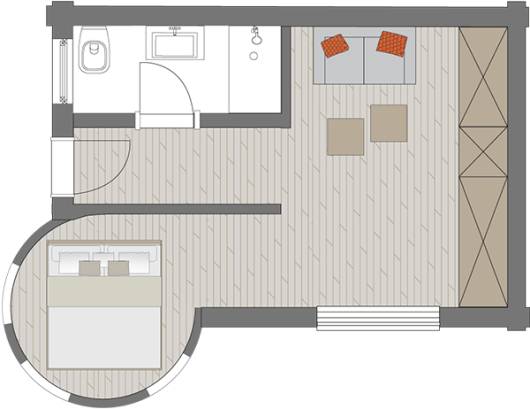 Zimmerausstattung: Sitzecke mit Schlafsofa für 2 Personen, zwei Sessel, Schreibtisch mit Minibar, Flachbild-TV, Safe, freies Wifi, Durchwahltelefon, Kofferablage, Bad mit Dusche, WC, Fön, Kosmetikspiegel, Rundes Bett: 200 cm lang x 180 cm breit, Schlafsofa: 180 cm lang x 160 cm breit.