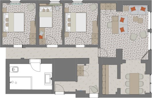 Zimmerausstattung: Drei separate Schlafzimmer für je 2 Personen, zwei Flachbild TVs, Wohnzimmer mit Schalfsofa für 2 Personen, Sessel, Schreibtisch, separate, gut ausgestattete Küche mit Essbereich, Safe, freies Wifi, Durchwahltelefon, Kofferablage, Bad mit Dusche, WC, Fön, Kosmetikspiegel, 2 x Doppelbett: 200 cm lang x 180 cm breit, Einzelbett: französisches Bett 200 cm lang x 140 cm breit, Schlafsofa: 180 cm lang x 160 cm breit.